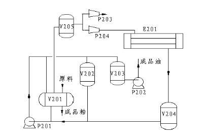 油脂浸出工藝過程為:1、油料裝入浸出罐V201;2、溶劑泵P201將4號溶劑注入浸出罐浸泡油料;3、溶劑泵P201從浸出罐抽出混合油打入蒸發(fā)罐V203;4、聯(lián)通浸出罐與壓縮機(jī)P204吸氣口,使粕中殘溶氣化,進(jìn)入壓縮機(jī),經(jīng)壓縮、冷凝器E201冷凝液化,溶劑回流到溶劑周轉(zhuǎn)罐V204,再循環(huán)使用。粕排出浸出系統(tǒng)。5、混合油進(jìn)入蒸發(fā)系統(tǒng),使4號溶劑蒸發(fā)后與毛油分離。溶劑蒸氣經(jīng)壓縮液化后循環(huán)使用。毛油排出浸出系統(tǒng)。