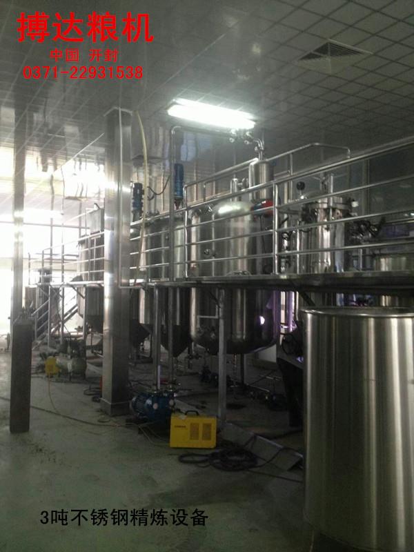 大豆油精煉設(shè)備熱脫皮工藝,今年來(lái),大豆油熱脫皮工藝得到較快的發(fā)展和推廣,大豆油熱脫皮紅衣的形式很多,經(jīng)過(guò)處理后的大豆直接進(jìn)入流化床加熱干燥,使表面溫度達(dá)到75-92攝氏度,大豆所含水分9%左右,這主要是為了加熱大豆皮和表層,皮松脆易于裂開(kāi)。然后由輥破碎機(jī)將大豆對(duì)半破開(kāi)分為兩瓣,并落入撞擊機(jī)利用撞擊機(jī)作用使豆皮從仁粒上松脫下來(lái),經(jīng)吸風(fēng)分離器進(jìn)行脫皮分離,經(jīng)部分脫皮的半粒狀大豆再經(jīng)過(guò)齒輥破碎機(jī)破碎成符合軋坯要求的粒度,而后又經(jīng)撞擊機(jī)和多級(jí)撞擊和多級(jí)吸風(fēng)分離器進(jìn)行第二次脫皮分離,分離出的豆仁至下道工序,豆皮收集后送至豆皮倉(cāng)庫(kù),該工藝與冷脫皮工藝相比周期短,短時(shí)間的高溫處理減少了大豆油中油脂的變質(zhì)和蛋白質(zhì)的變性。熱大豆破碎后的粉末度減小,這將更有利于皮仁的分離,減少皮中的含仁量。經(jīng)脫皮后的熱豆??芍苯舆M(jìn)行軋坯,或?yàn)榧訜彳浕笤偃ボ埮?,這將大大降低生產(chǎn)過(guò)程中的蒸汽消耗。